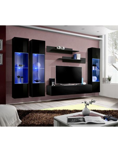 Banc TV avec une porte abattante derrière laquelle il y a 3 compartiments de rangement. Vitrine à suspendre en verre avec 2 compartiments fermés. Composée de 3 étagères en verre avec le triple éclairage LED bleu, visibles également lorsque la porte est fermée. Deux étagères murales sont incluses. Tous les fronts sont en PVC à haute brillance. Les portes à système d?ouverture «pousse-lâche».