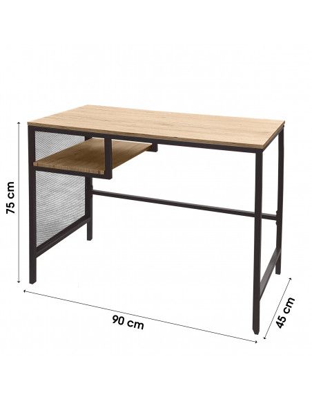 Le côté du bureau qui comprend l'étagère possède un grillage en fer.