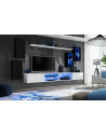 2x meuble TV suspendu : une étagère en verre avec une lumière LED bleue d'un côté, de l'autre un abattant soutenu par des pompes hydrauliques. Façades avec système d'ouverture par poussée-clic.