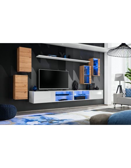2x meuble TV suspendu : une étagère en verre avec une lumière LED bleue d'un côté, de l'autre un abattant soutenu par des pompes hydrauliques.