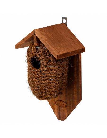 Ce nid traditionnel en coco offre au troglodyte mignon un bon endroit pour se nicher et préserver la population de cette espèce doiseau dans nos régions. En outre, le nid est un bon moyen pour les oiseaux de se protéger du mauvais temps en hiver. Placez le nichoir sur un arbre ou un mur, jusqu'à une hauteur maximale de 2 mètres, dans un endroit bien caché entre des buissons épais et des lierre.