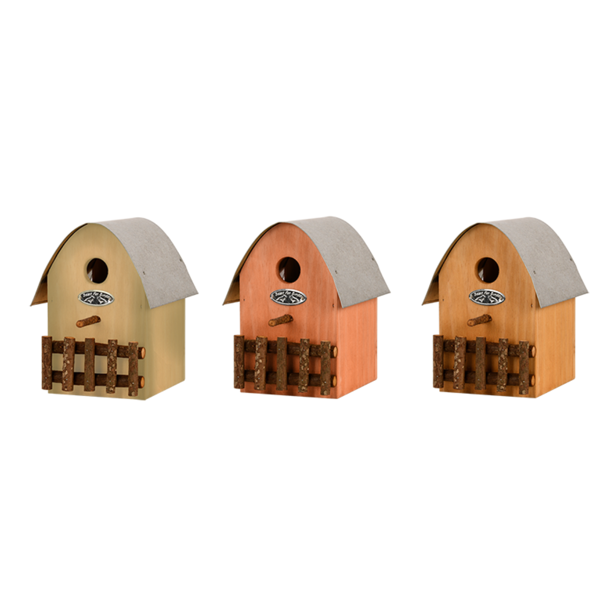 Nichoir décoratif avec application de clôture en trois couleurs différentes. Convient aux grandes mésanges, aux mésanges bleues, aux moineaux et aux moucherolles. Ces nichoirs sont accrochés à un illet métallique. Astuce: accrochez à au moins 1,8m au-dessus du sol avec une distance d'au moins 10 mètres jusqu'au prochain nichoir. Dimensions : 15 x 22,2 x 20 cm.