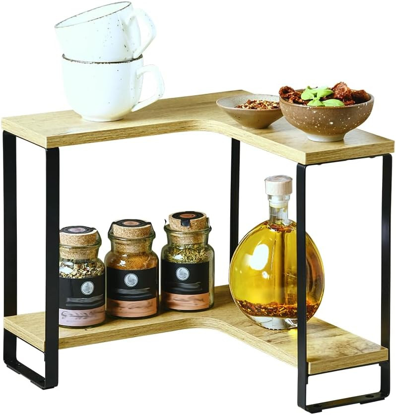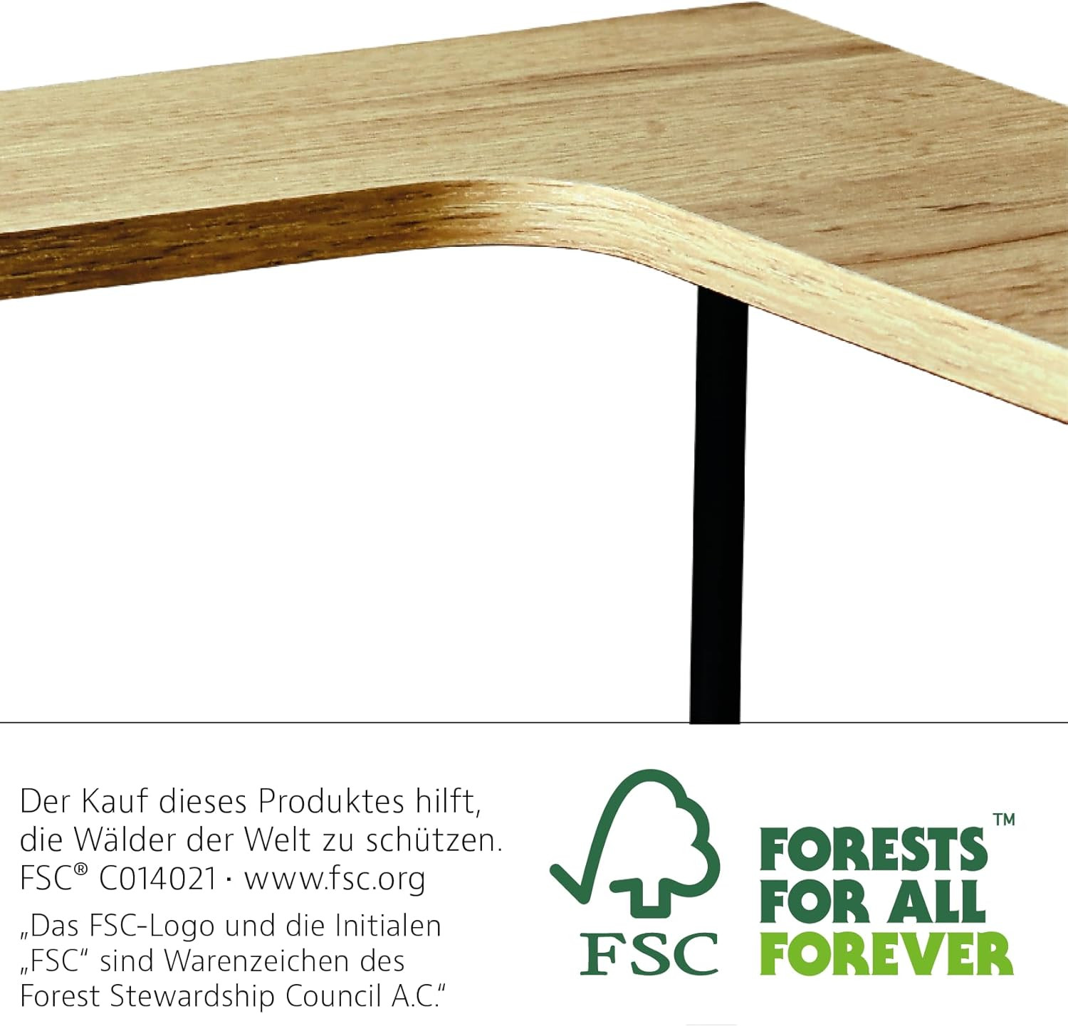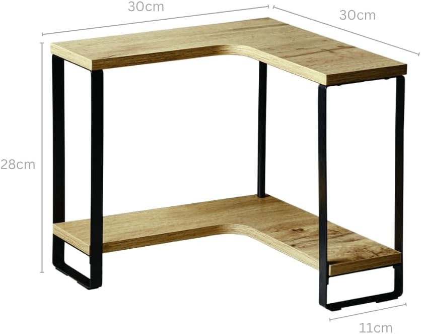 Deux niveaux offrent un rangement pratique dans un format compact. Le design biseauté optimise les angles pour gagner de la place. La structure métallique noire assure une grande stabilité. Le plateau en MDF certifié FSC apporte une finition chaleureuse. Idéale pour épices, tasses et objets décoratifs.
