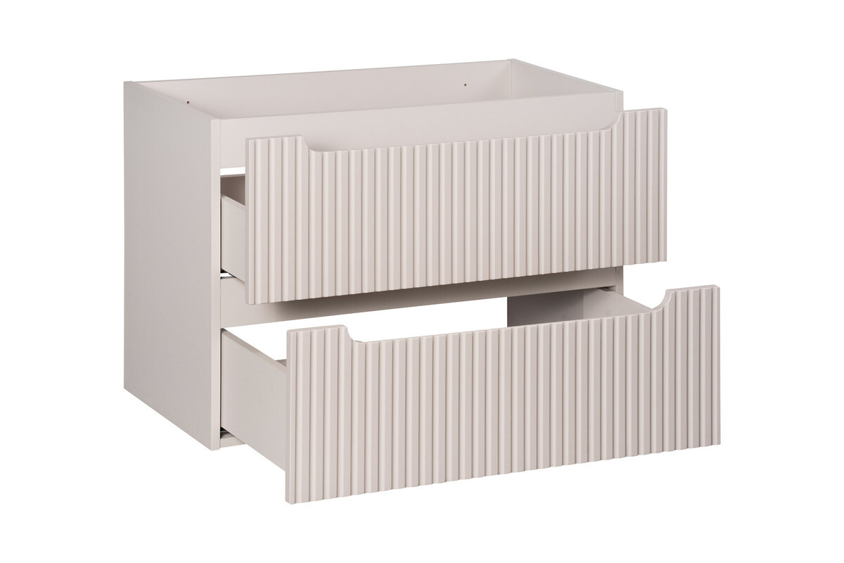 La composition comprend un meuble sous vasque de 80 cm équipé de deux tiroirs, offrant un espace de rangement fermé pratique pour les produits du quotidien. Les façades sont réalisées en MDF 16 mm avec un rainurage vertical décoratif, tandis que le corps est conçu en panneaux stratifiés 16 mm. Le meuble présente une profondeur réduite de 40 cm, facilitant lintégration dans les espaces restreints. Meuble à monter soi-même.