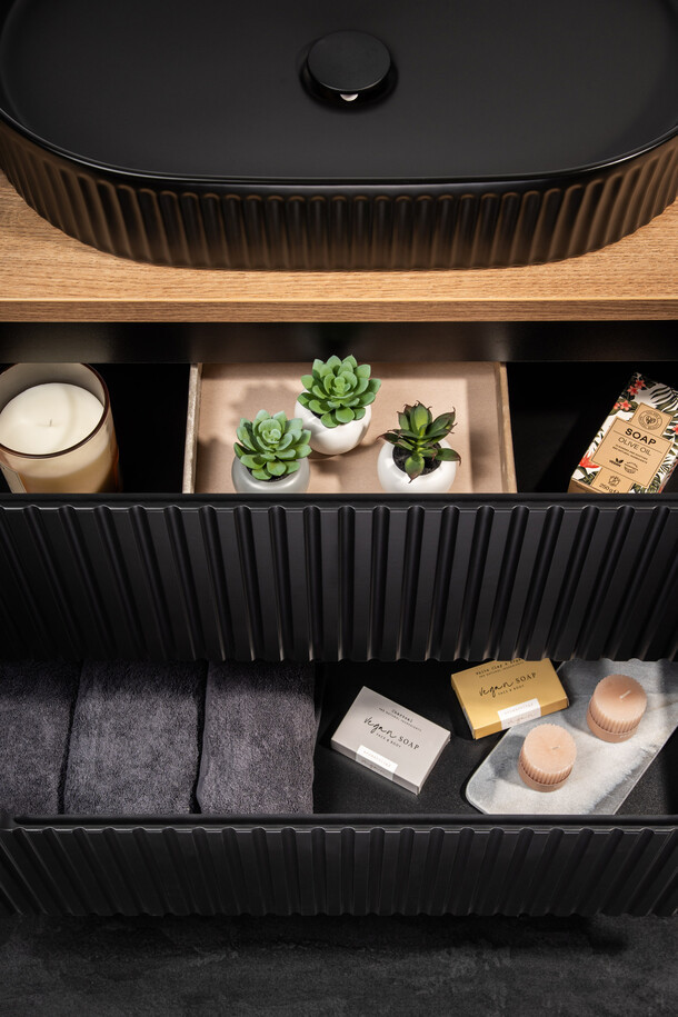 Pensée pour un usage quotidien fluide, la collection intègre un système de fermeture en douceur, garantissant confort et durabilité. Grâce à sa modularité et à sa profondeur réduite, Astral Black permet de créer une salle de bain harmonieuse, fonctionnelle et durable, même dans les espaces les plus compacts.