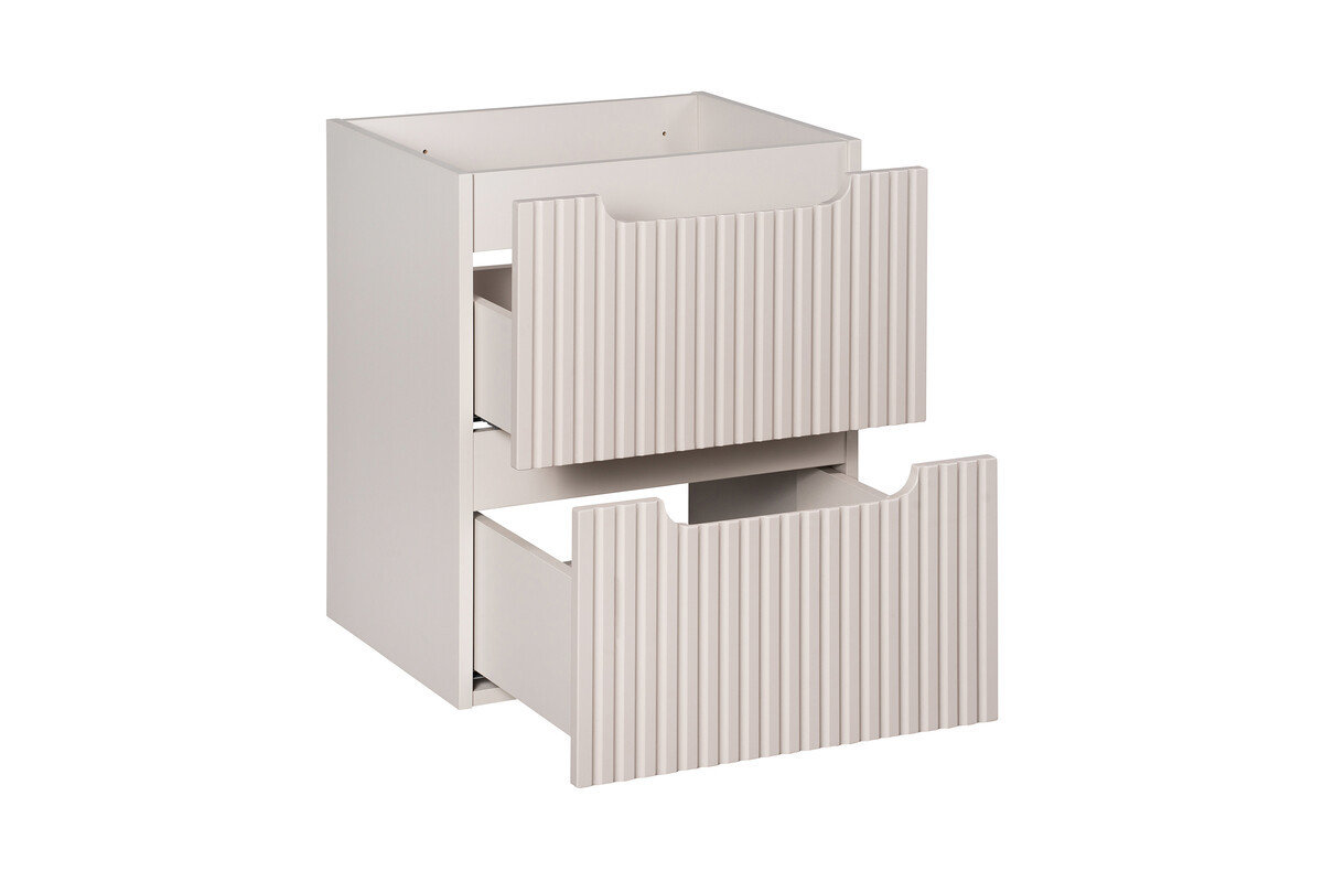 La composition comprend un meuble sous vasque de 50 cm équipé de deux tiroirs, offrant un espace de rangement fermé pratique pour lorganisation des produits du quotidien. Les façades sont réalisées en MDF 16 mm avec un rainurage vertical décoratif, tandis que le corps est conçu en panneaux stratifiés 16 mm. Sa profondeur réduite de 40 cm facilite lintégration dans les espaces restreints. Meuble à monter soi-même.