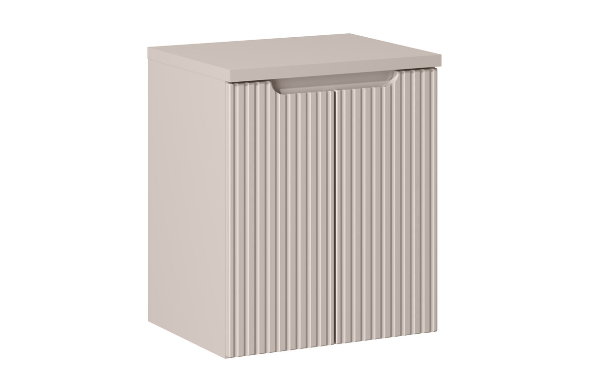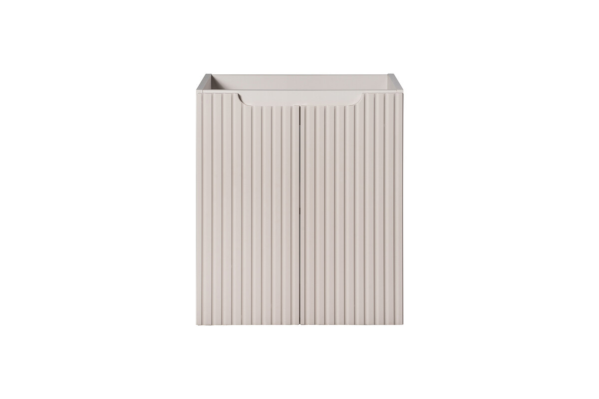 La composition comprend un meuble sous vasque de 50 cm équipé de deux portes, offrant un espace de rangement fermé pratique pour les produits du quotidien. Les façades sont réalisées en MDF 16 mm avec un rainurage vertical décoratif, tandis que le corps est conçu en panneaux stratifiés 16 mm. Le meuble présente une profondeur réduite de 40 cm, facilitant lintégration dans les espaces restreints. Meuble à monter soi-même.