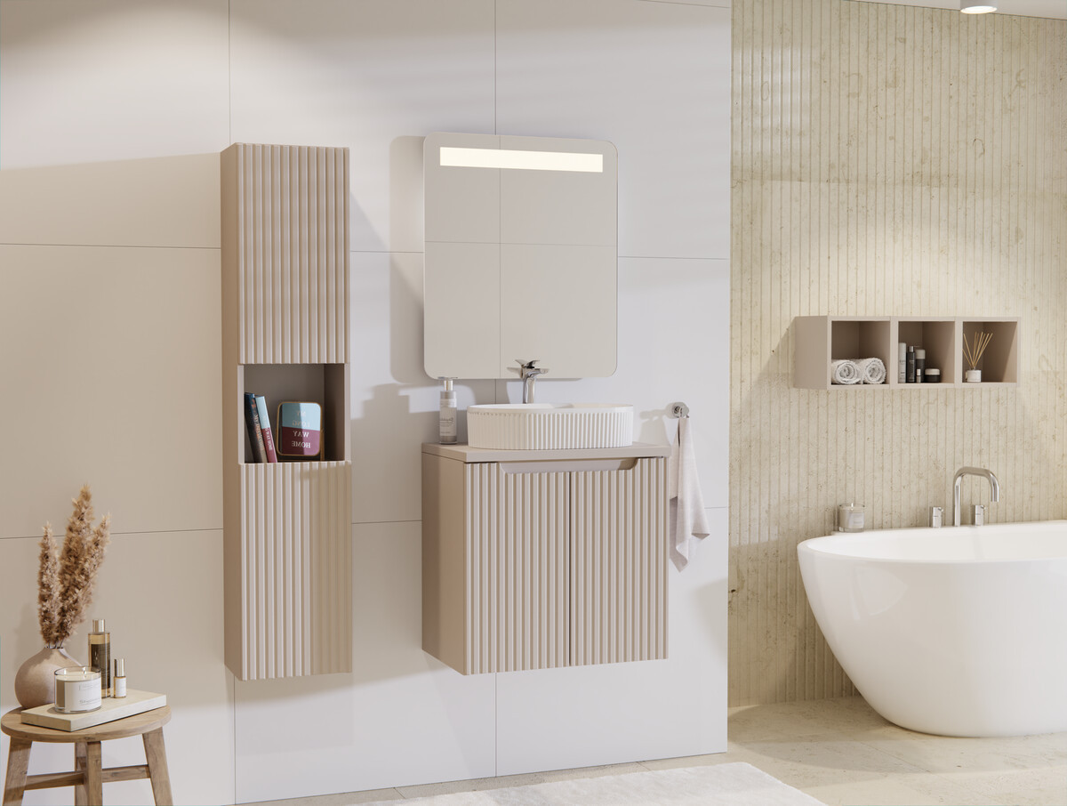 La composition comprend un meuble sous vasque de 60 cm équipé de deux portes, offrant un espace de rangement fermé pratique pour les produits du quotidien. Les façades sont réalisées en MDF 16 mm avec un rainurage vertical décoratif, tandis que le corps est conçu en panneaux stratifiés 16 mm. Le meuble présente une profondeur réduite de 40 cm, facilitant lintégration dans les espaces restreints. Meuble à monter soi-même.