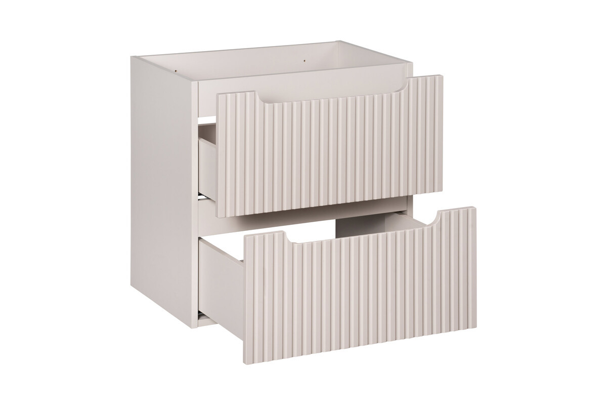 La composition comprend un meuble sous vasque de 60 cm équipé de deux tiroirs, offrant un espace de rangement fermé pratique pour les produits du quotidien. Les façades sont réalisées en MDF 16 mm avec un rainurage vertical décoratif, tandis que le corps est conçu en panneaux stratifiés 16 mm. Le meuble présente une profondeur réduite de 40 cm, facilitant lintégration dans les espaces restreints. Meuble à monter soi-même.