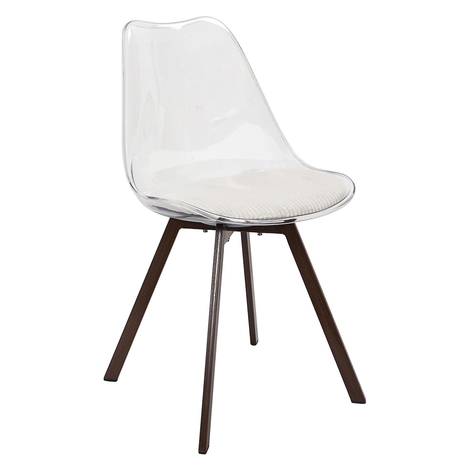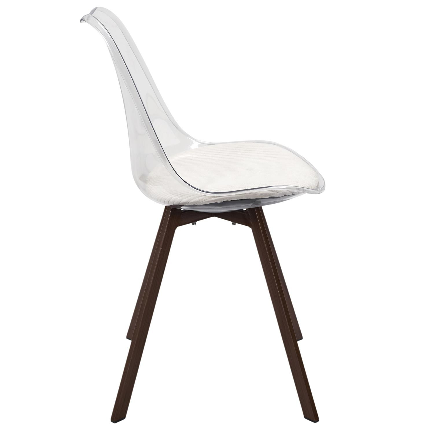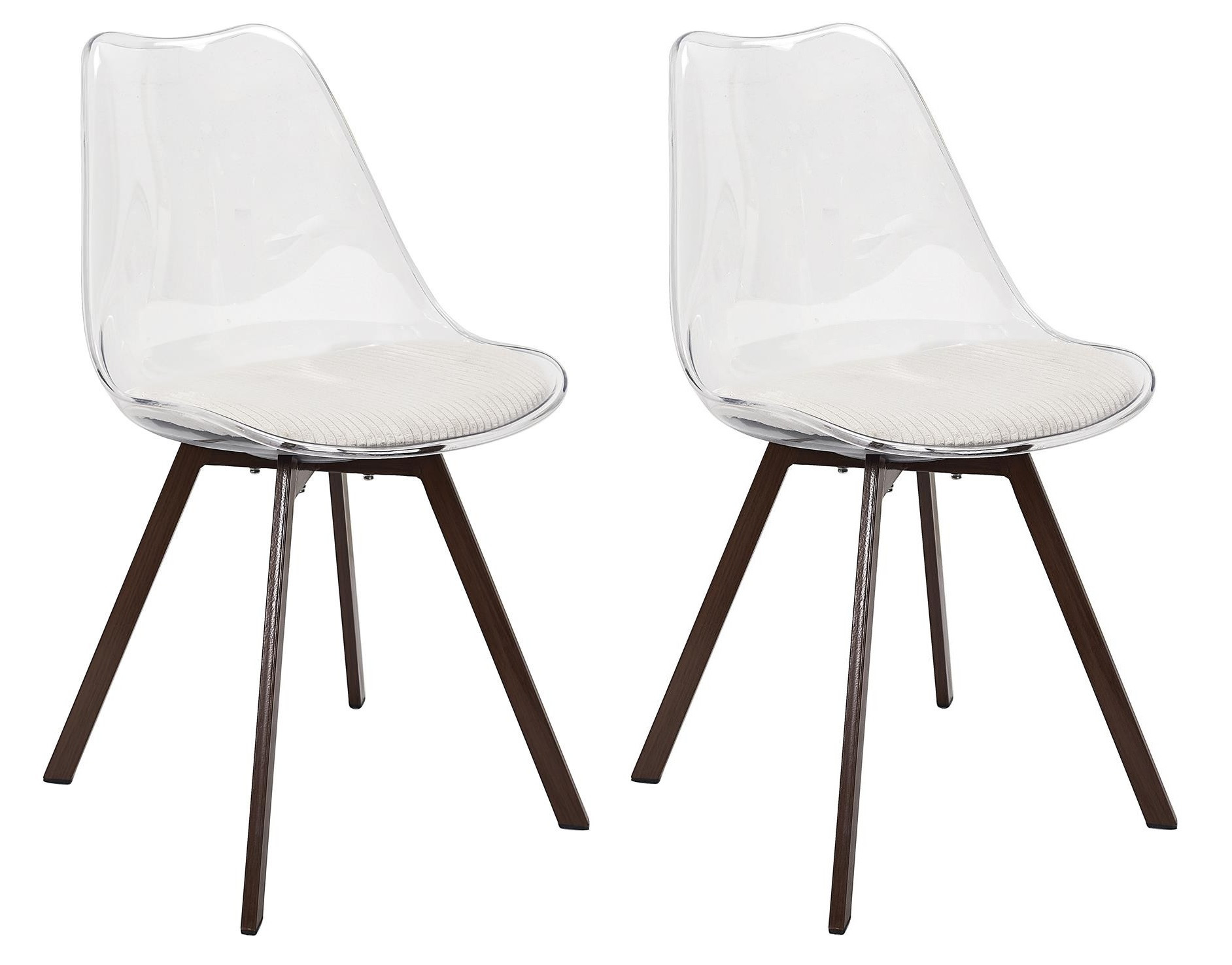 Lot de 2 chaises design avec dossier transparent et coussin côtelé blanc.