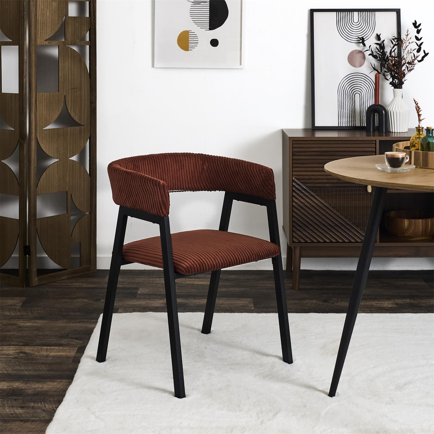 Ce fauteuil se distingue par sa teinte terracotta chaleureuse et tendance. Lassise et le dossier rembourrés intégrés offrent un excellent confort, tandis que le piètement métallique garantit robustesse et stabilité. Une pièce forte pour dynamiser une salle à manger ou un espace de vie.
