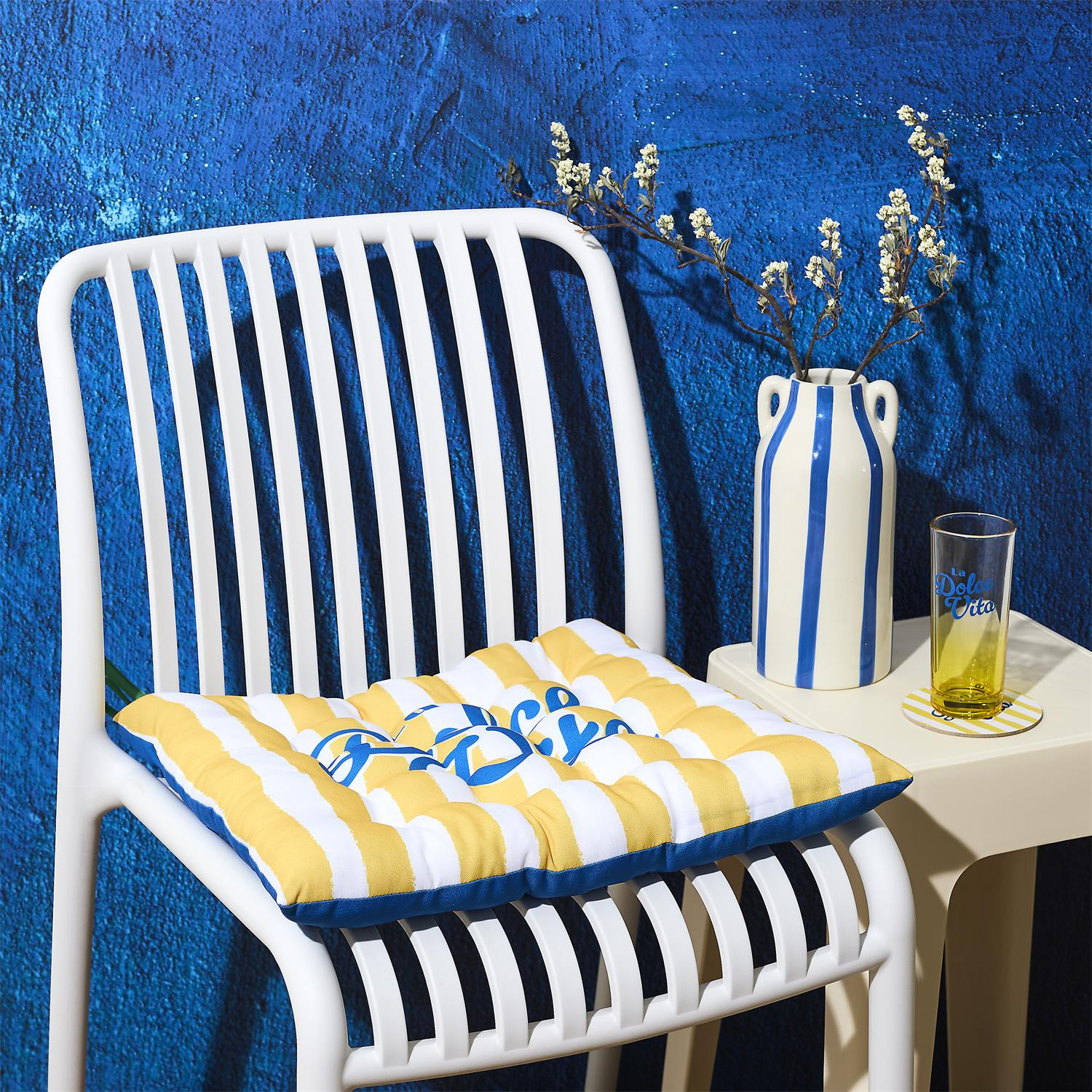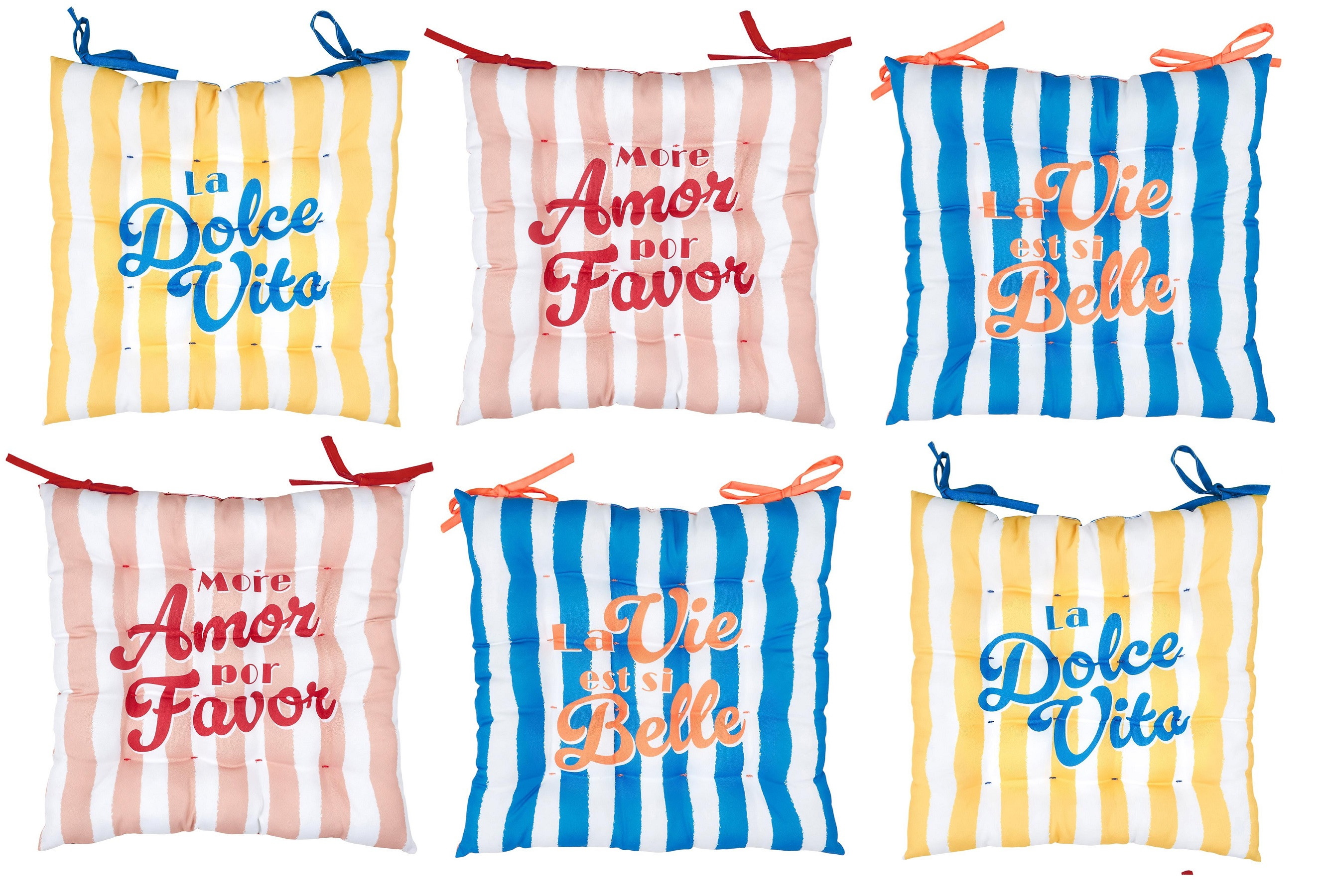 Lot de 6 galettes de chaise carrées avec motifs estivaux inspirés de lunivers Dolce Vita.