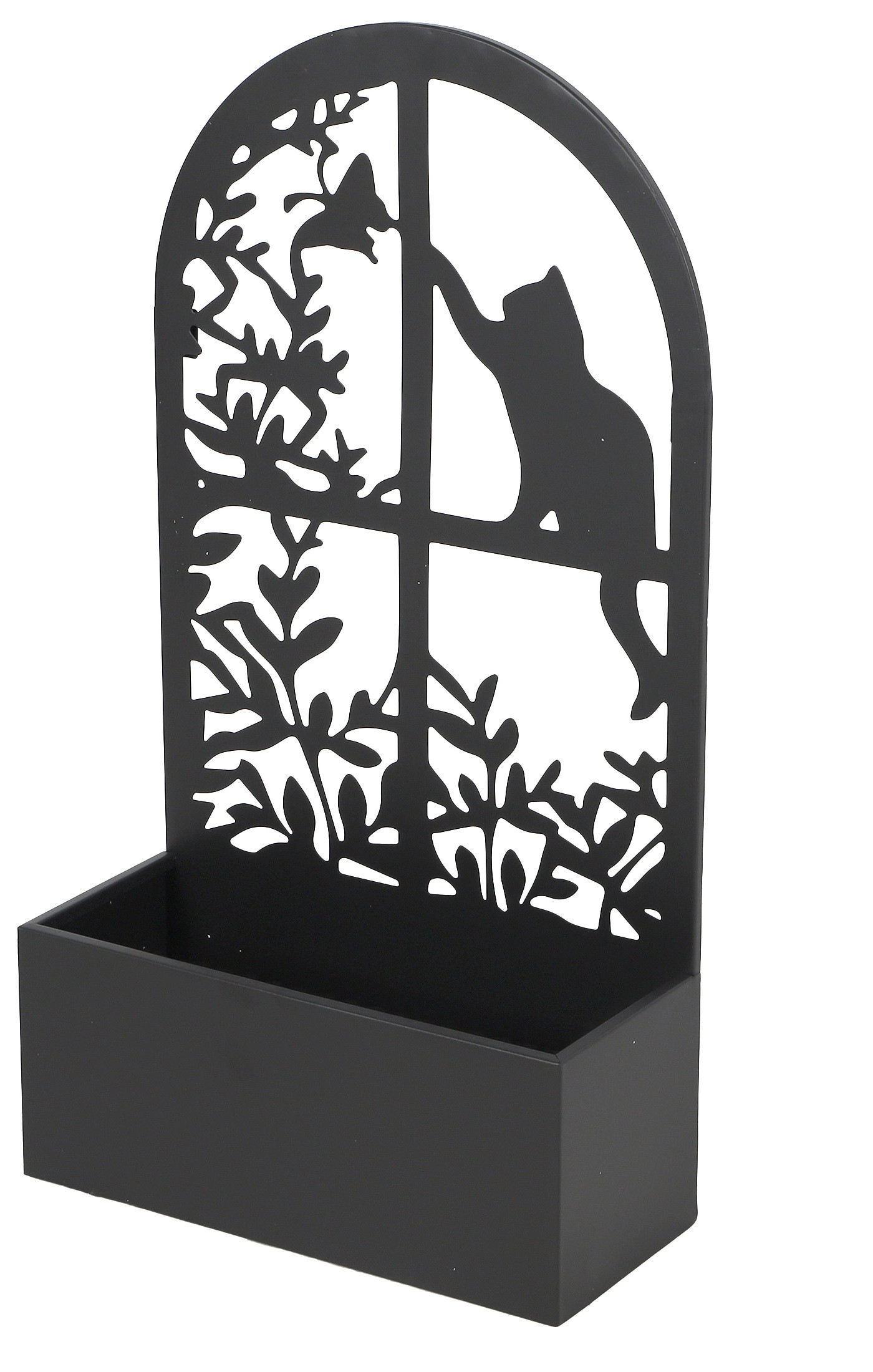 Cache-pot mural en métal noir avec motif décoratif chat et fenêtre.